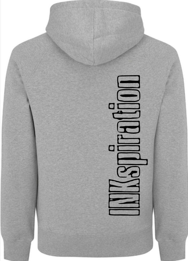 Grauer Hoodie "Inkspiration"-Print auf der Vorderseite. Zusätzlicher Schriftzug "Inkspiration" auf dem Rücken . Stoff aus 100% Baumwolle. schwarzer Print